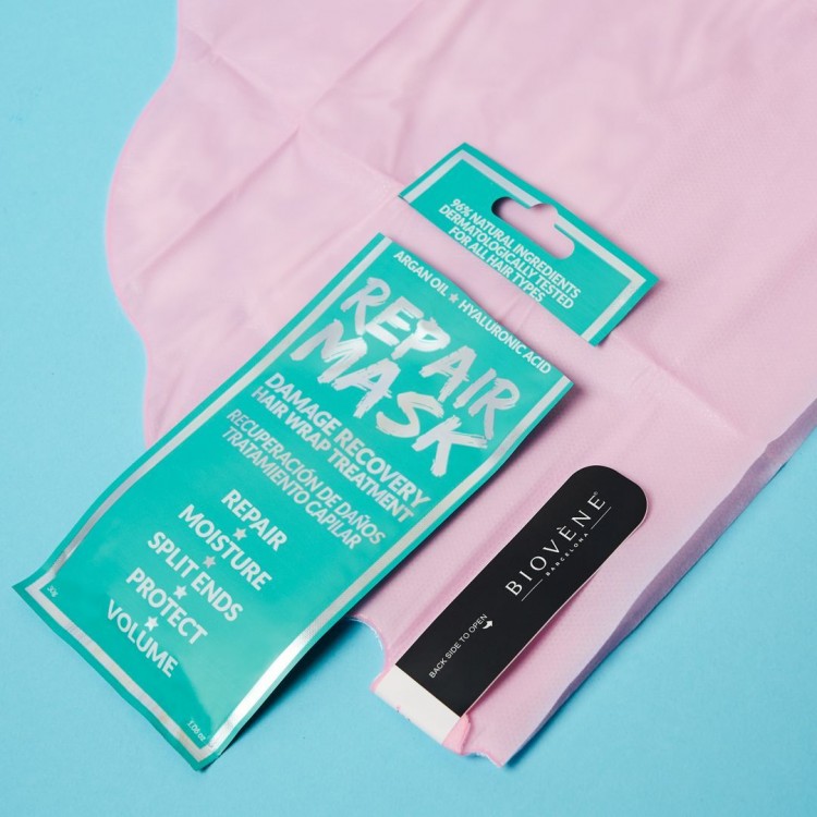 ИНОВАТИВНА МАСКА ЗА ТРЕТМАН на ОШТЕТЕНА КОСА кој всушност е интензивен третман за сите типови коса кои се оштетени. Состојките - арганово масло + хијалуронска киселина се наоѓаат во оваа иновативна капа-обвивка со која треба да ја замотате миената чиста коса и да ја оставите да делува 20-тина минути, со нежна масажа. Со редовна употреба 2-3 пати месечно, видно ќе се подобри состојбата на сувата и оштетена коса и скалп, така што ќе стане доволно хидрирана, мазна, мека и свиленкасто нежна.