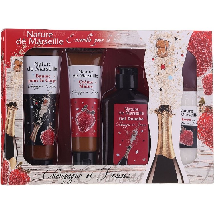 Сет со мирис на јагоди и шампањ кој содржи: нежен гел за туширање 100 ml, хидратантна крема за раце 60 ml, хидратантен лосион за тело 150 ml и сапун 90 гр.